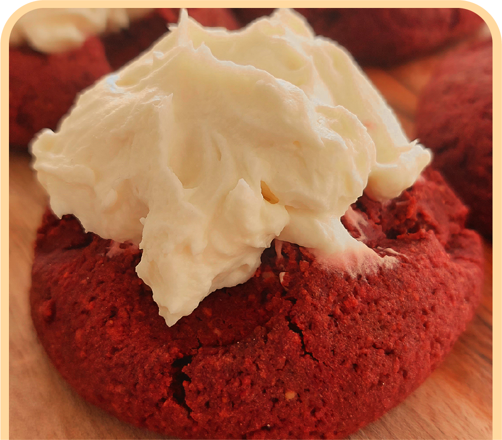 La famosa Cookie Red Velvet con su frosting de Vainilla en el medio y trozos de Chocolate Blanco elaborado de manera artesanal en nuestro obrador sin gluten, vegano y sin azúcar.